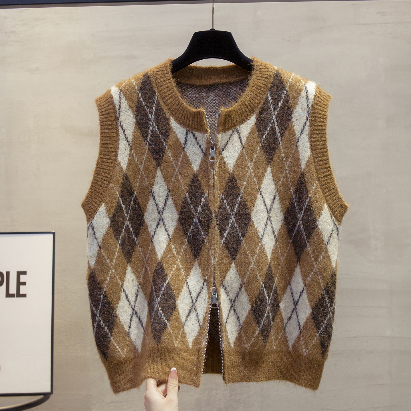 开衫菱格纹圆领针织马甲背心女2025秋冬新款宽松马夹叠穿毛衣坎肩