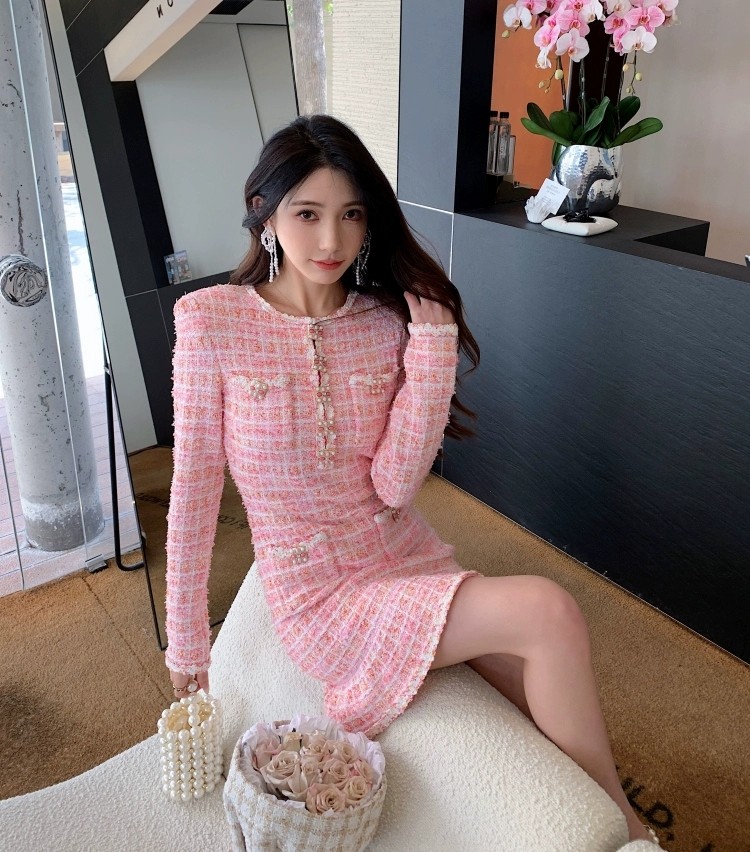糖力美2025秋季法式小香风名媛气质甜美粉色格子圆领针织连衣裙女