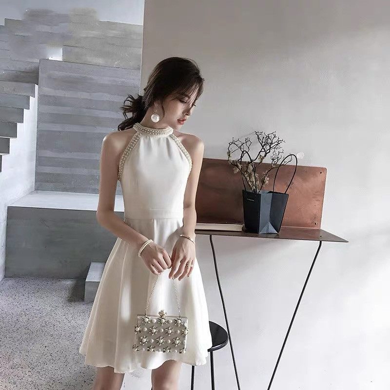 糖力美洋装小礼服2024夏季新款气质挂脖白色生日派对主持人连衣裙