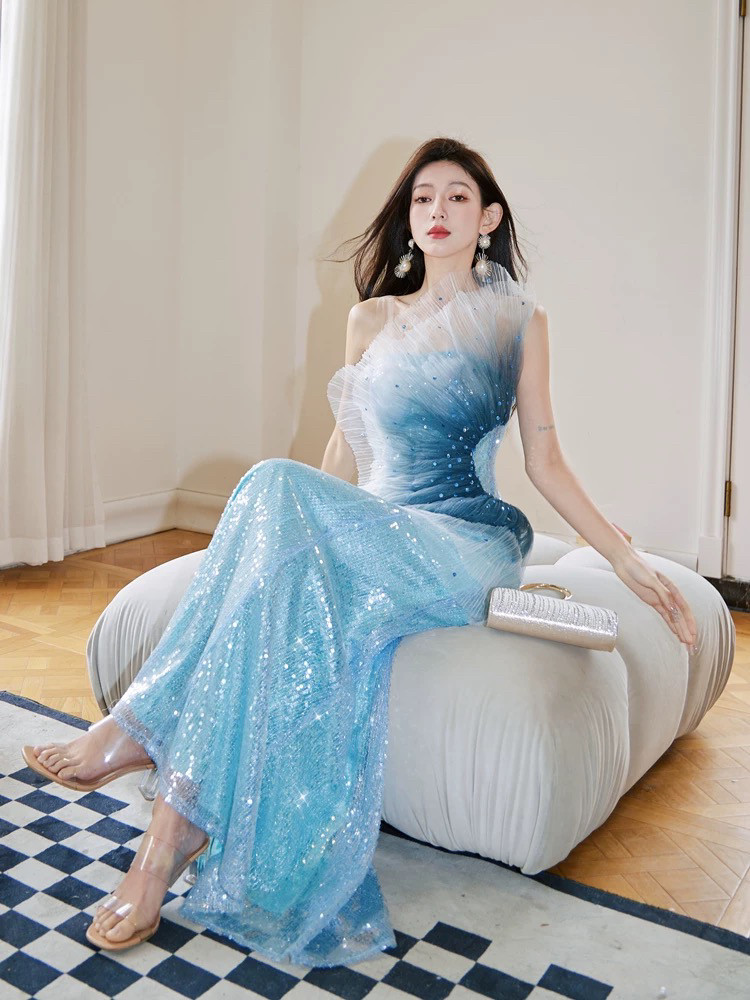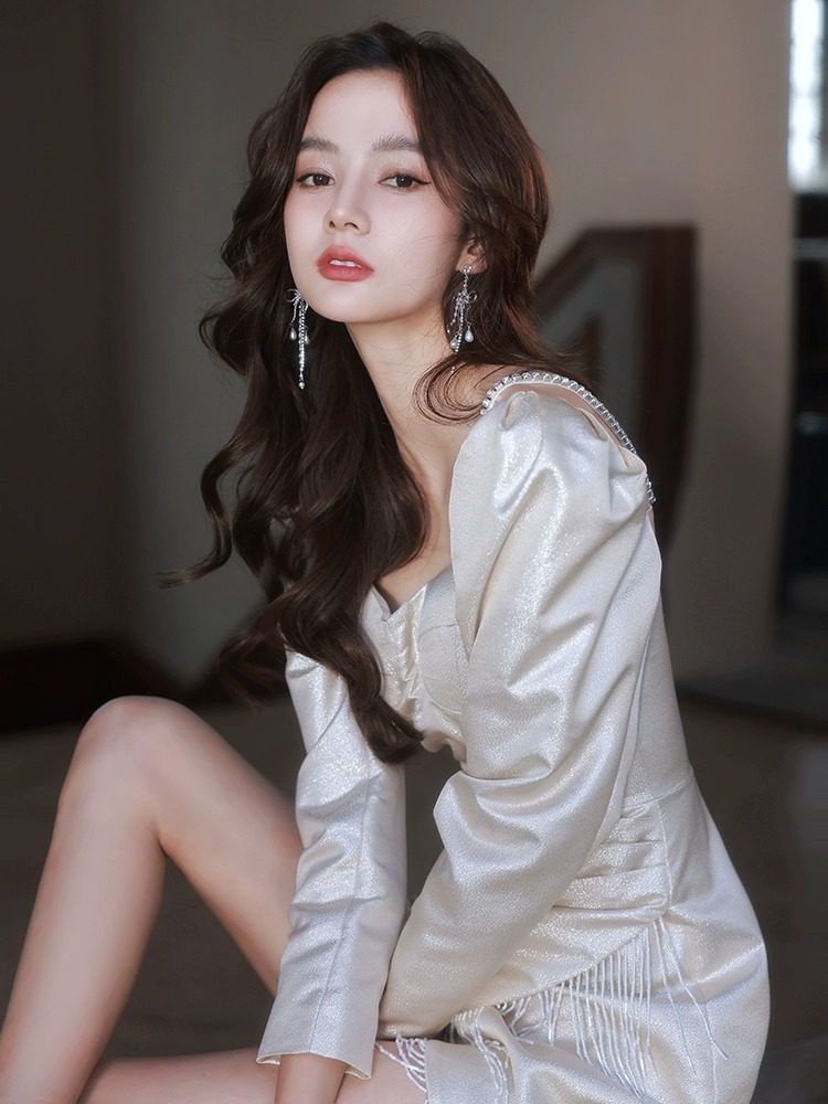 一字肩晚礼服裙女宴会订婚轻奢小众高端主持高定亮片香槟金色流苏