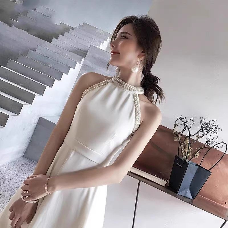 修身洋装小礼服2025时尚新款气质挂脖白色生日派对主持人连衣裙
