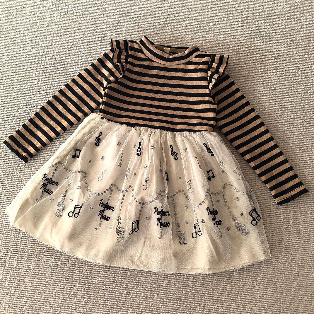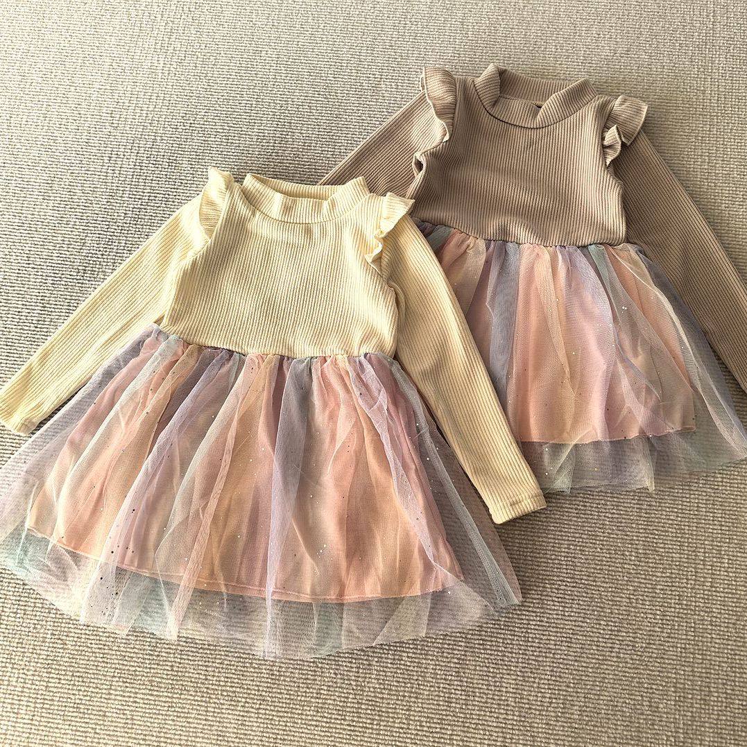 100-120码~外贸日单女孩长袖单面绒弹力不倒绒拼接纱裙连衣裙