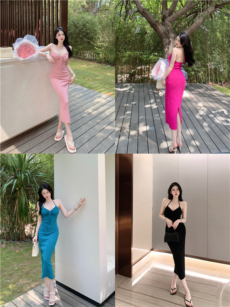 度假风性感弹力挂脖连衣裙女夏季v领系带纯欲收腰露背开叉背心裙