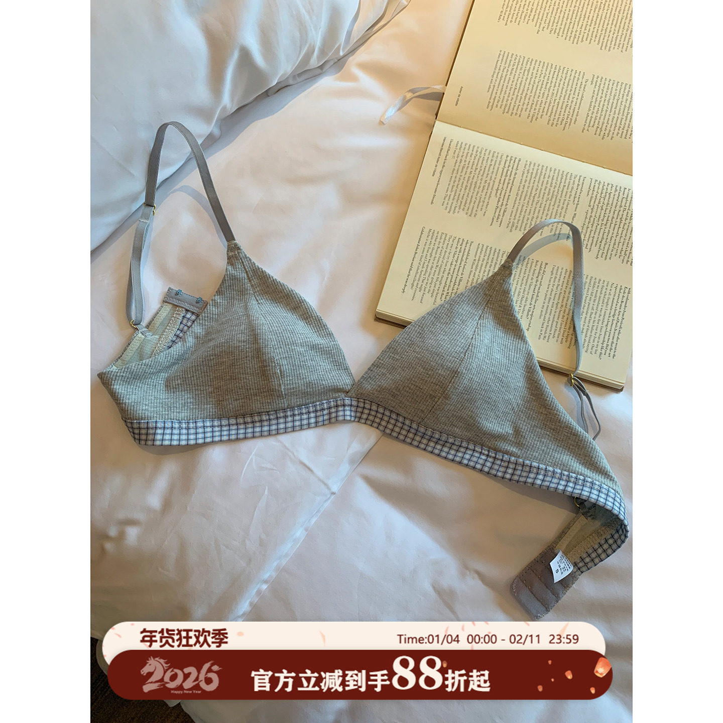 馨帮帮Bra 文艺风格子拼接三角杯内衣女薄款透气小胸聚拢无痕文胸