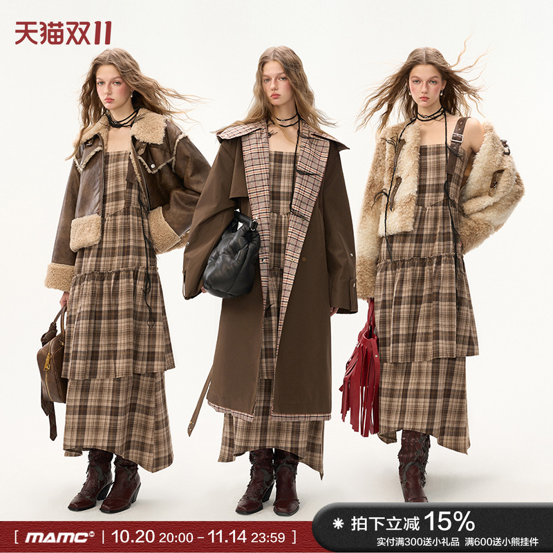 MAMC做旧格纹拼皮背带连衣裙秋冬款不规则仙女裙小众设计感长裙