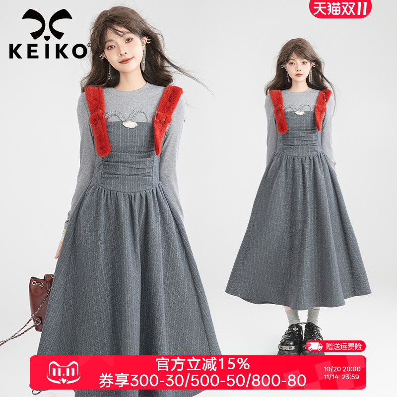 KEIKO 法式打揽薄毛呢背带连衣裙秋季撞色肩带显瘦A字吊带长裙子