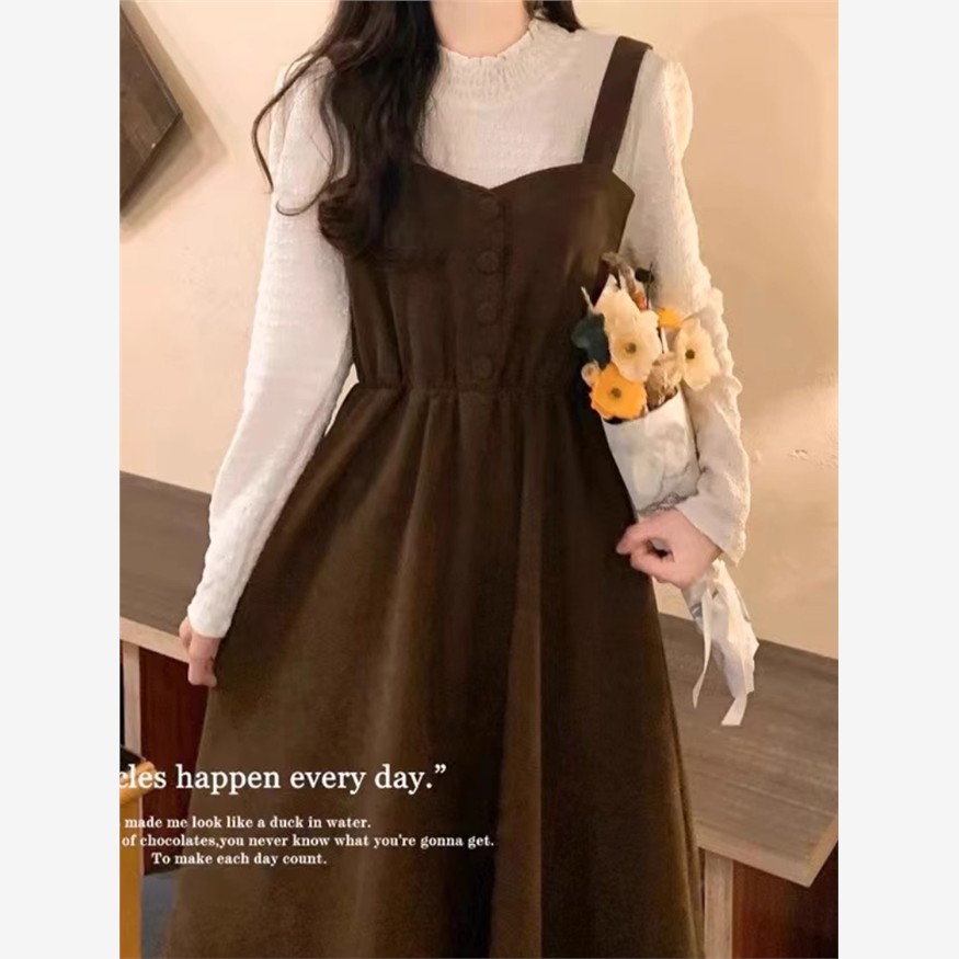 琥珀流光风日系棕色背带连衣裙女秋慵懒风宽松学生圆领叠穿背心裙