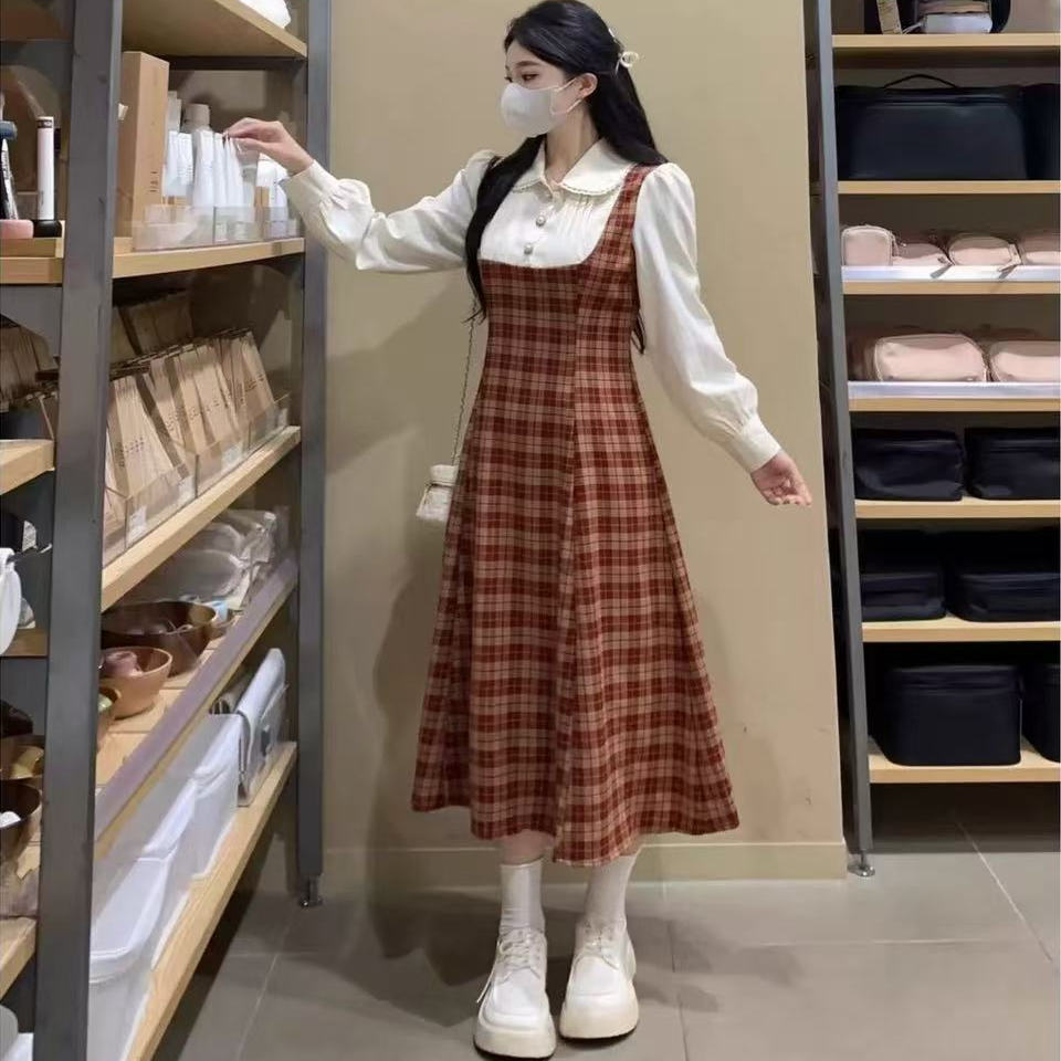 大码学院风设计感格纹背带连衣裙秋冬女胖MM收腰显瘦法式气质长裙
