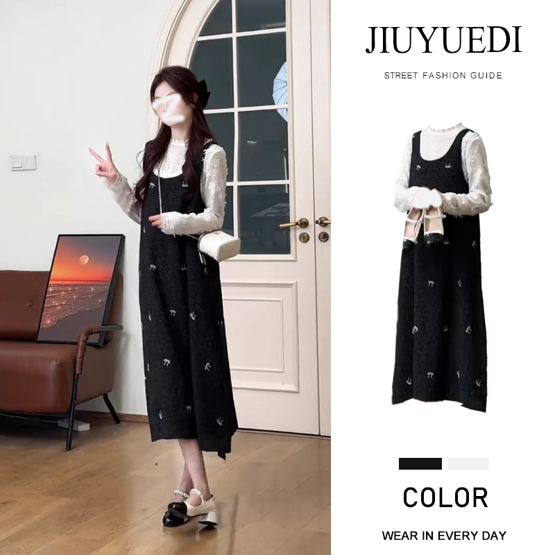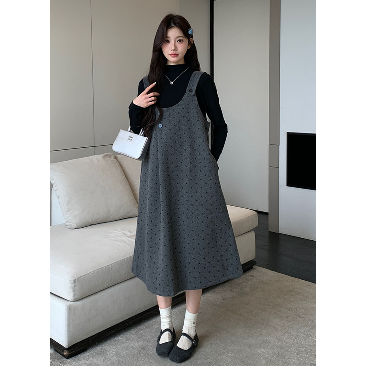 吴童童加绒加厚黑色波点背带裙女秋冬新款韩系气质宽松长款连衣裙
