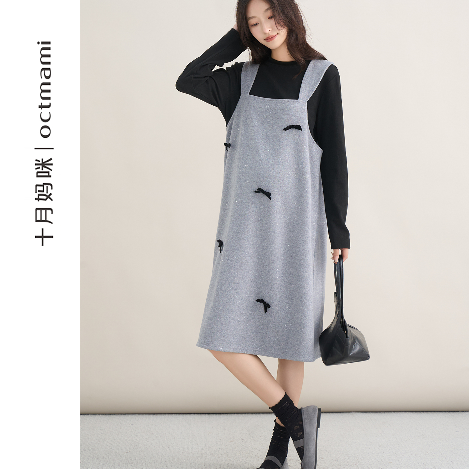 十月妈咪孕妇套装2025新款秋季外穿宽松遮肚蝴蝶结背带连衣裙秋装