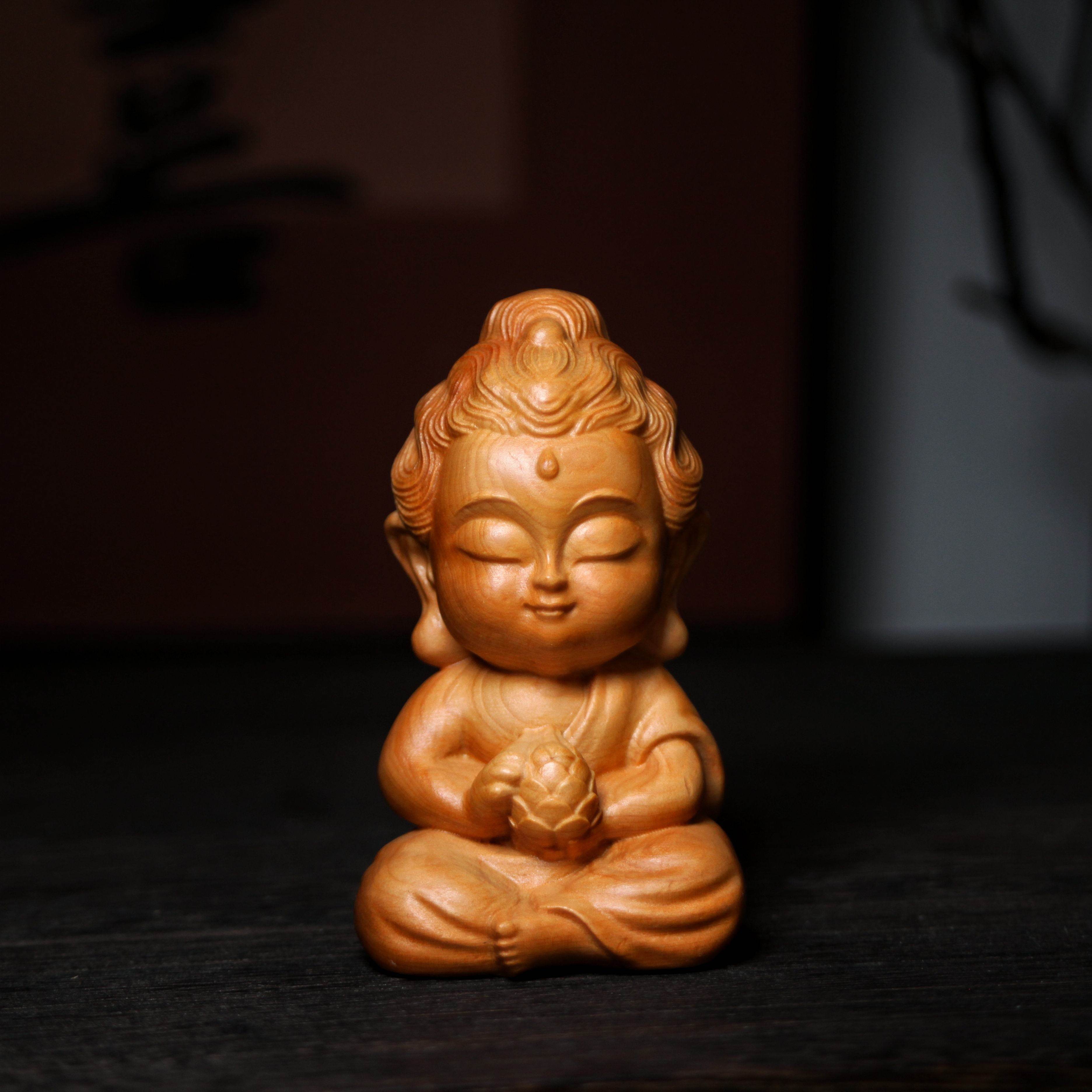 崖柏木雕莲花佛宝宝佛小沙弥手把件工艺品家居装饰品汽车创意摆件