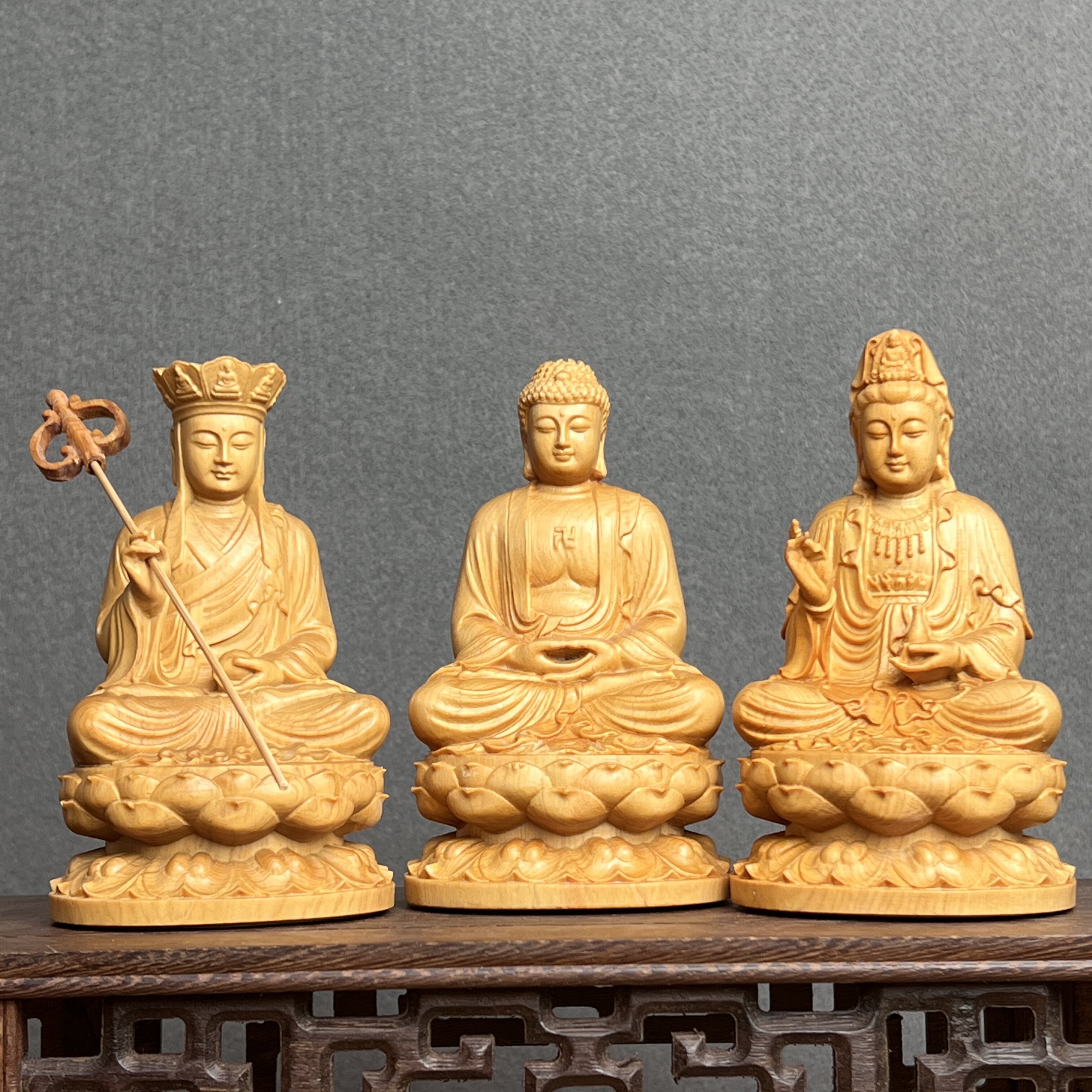 崖柏木雕娑婆三圣像释迦牟尼佛地藏王观音一佛二菩萨佛法组合摆件