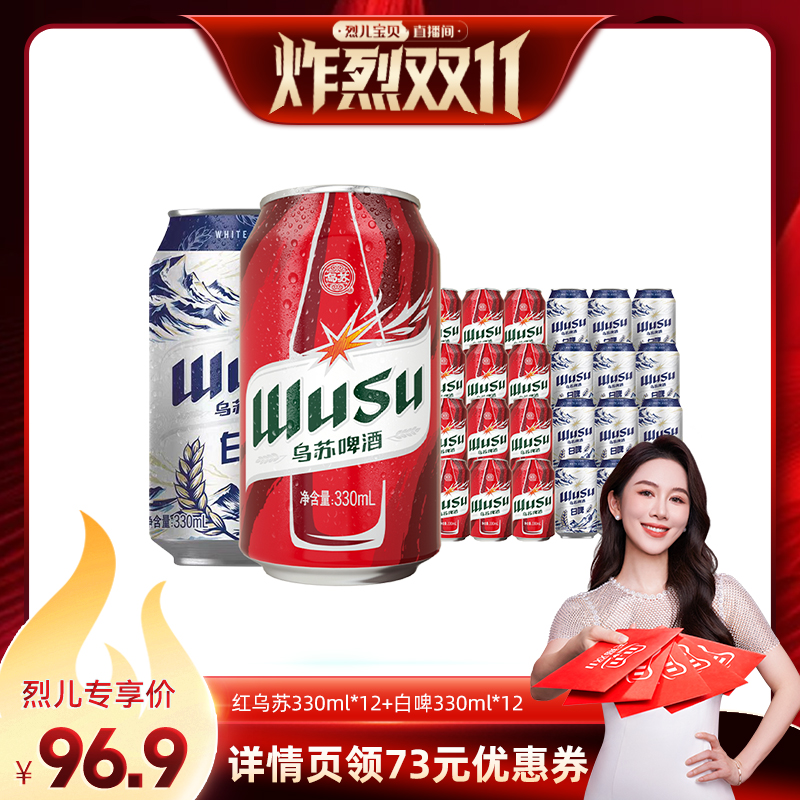 【付定!烈儿炸烈双11】红乌苏330ml*12罐+白啤330ml*12罐装