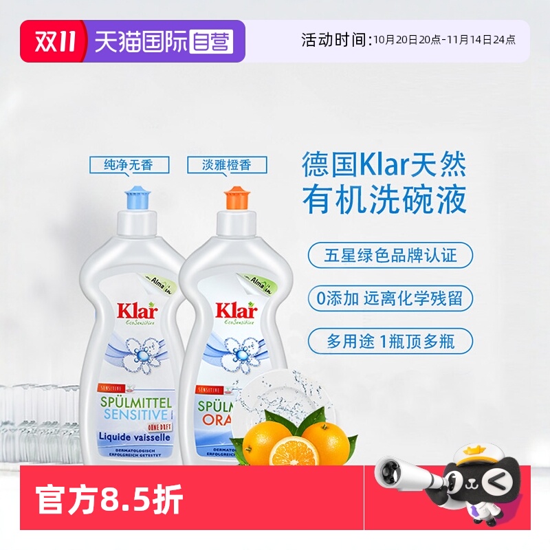 【自营】klar天然有机洗碗液餐具去油污植物浓缩洗洁精家用食品级