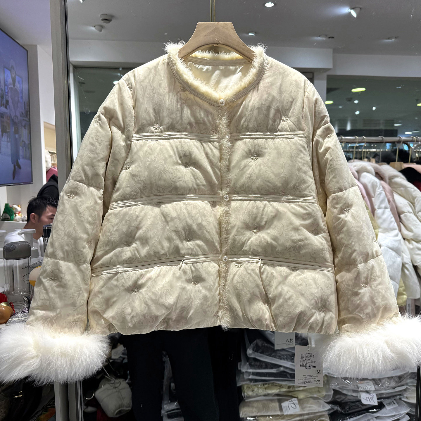 6810 串珠刺绣花水貂毛袖口高端国风铜氨丝短装鹅绒羽绒服欧货冬