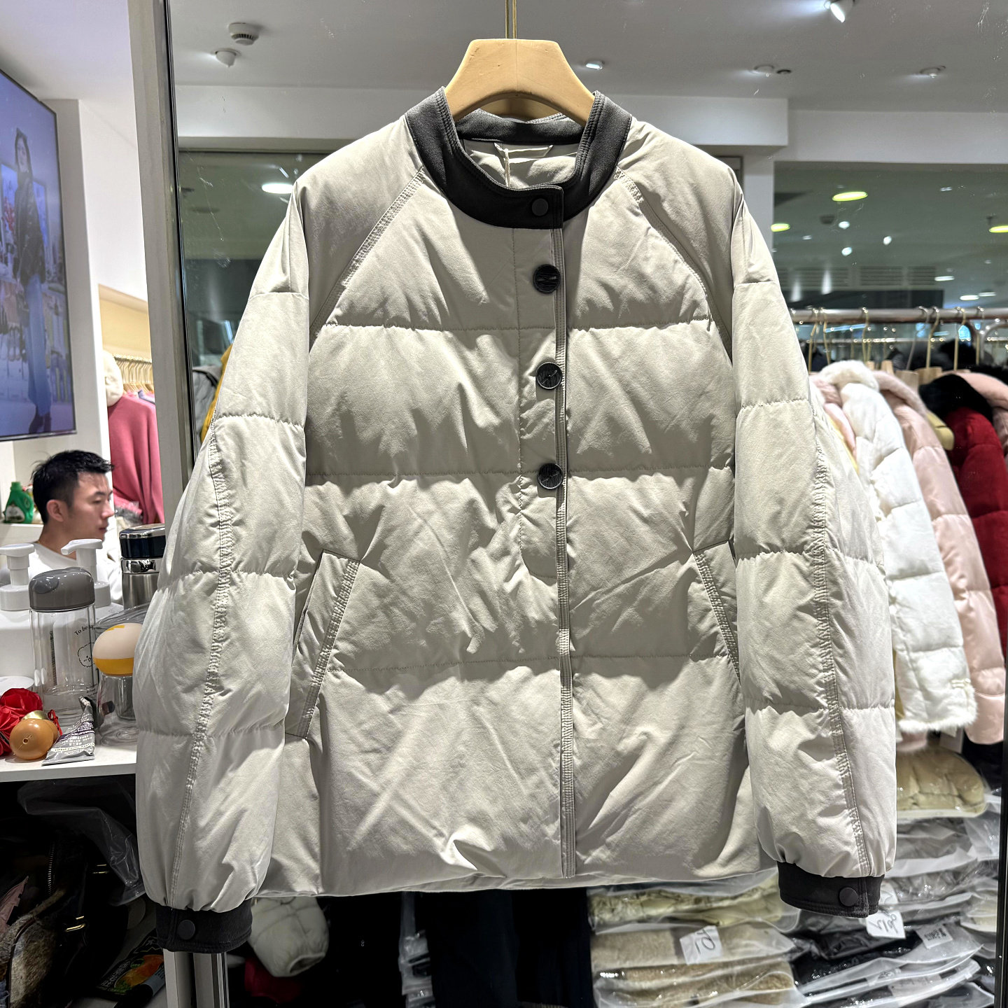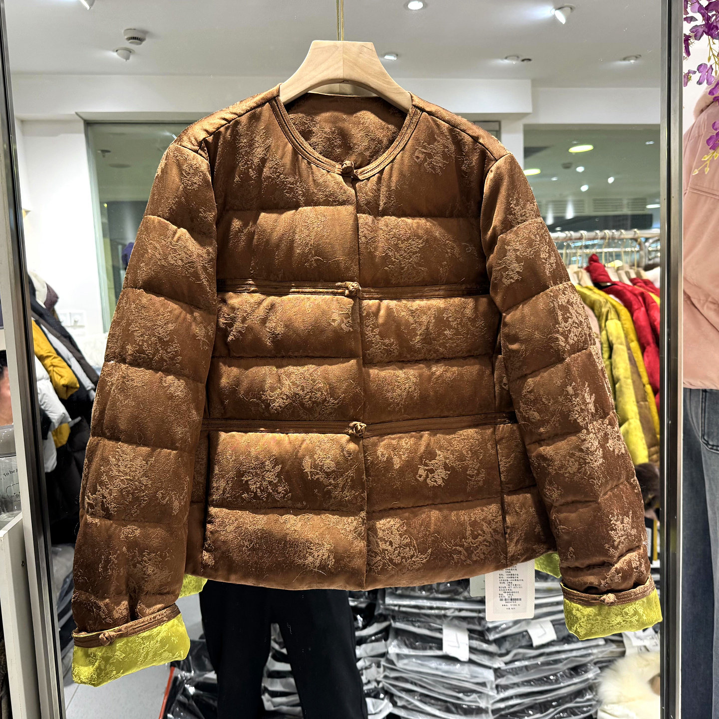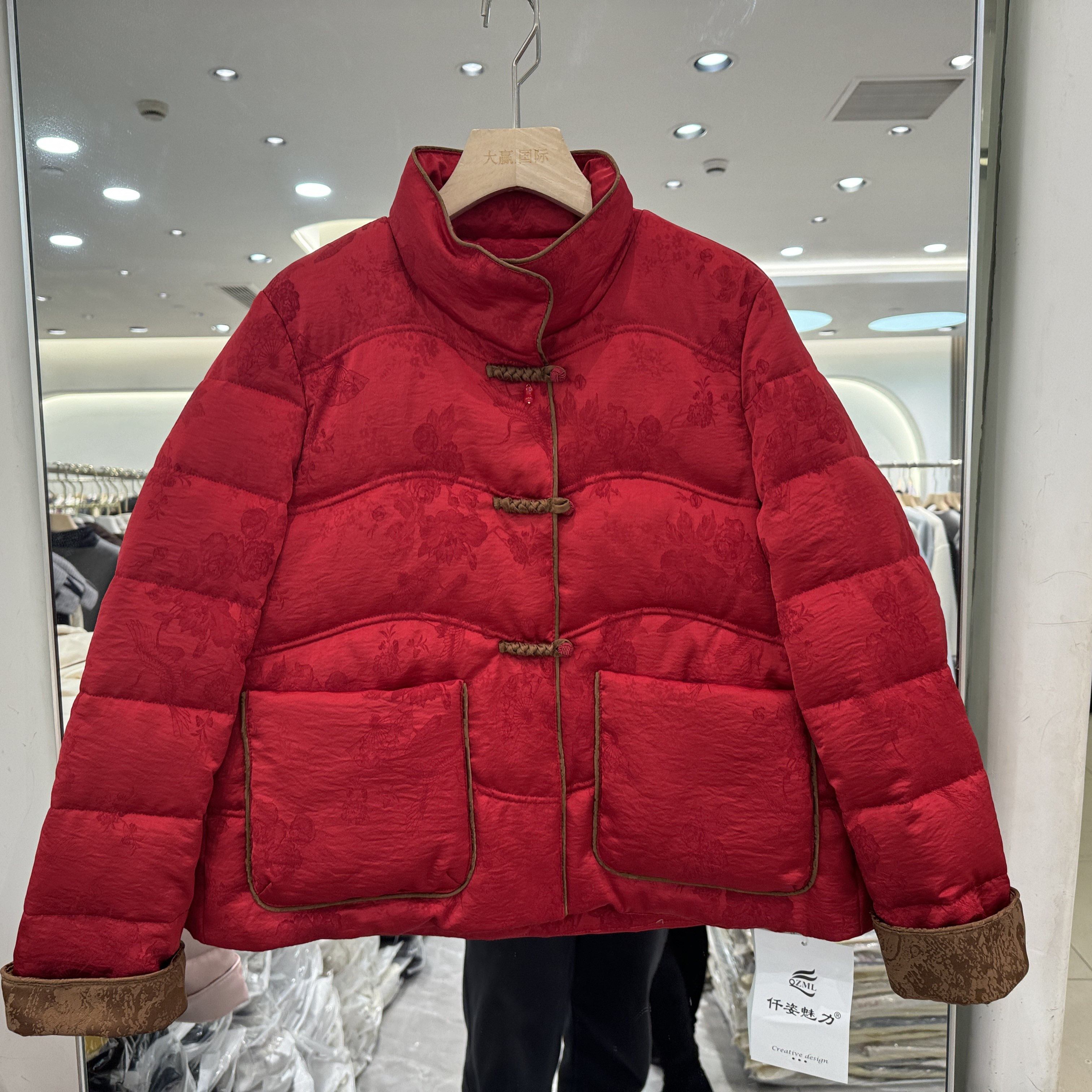 仟姿魅力6825 三粒盘扣立领提花新国风立领减龄短装羽绒服欧货冬