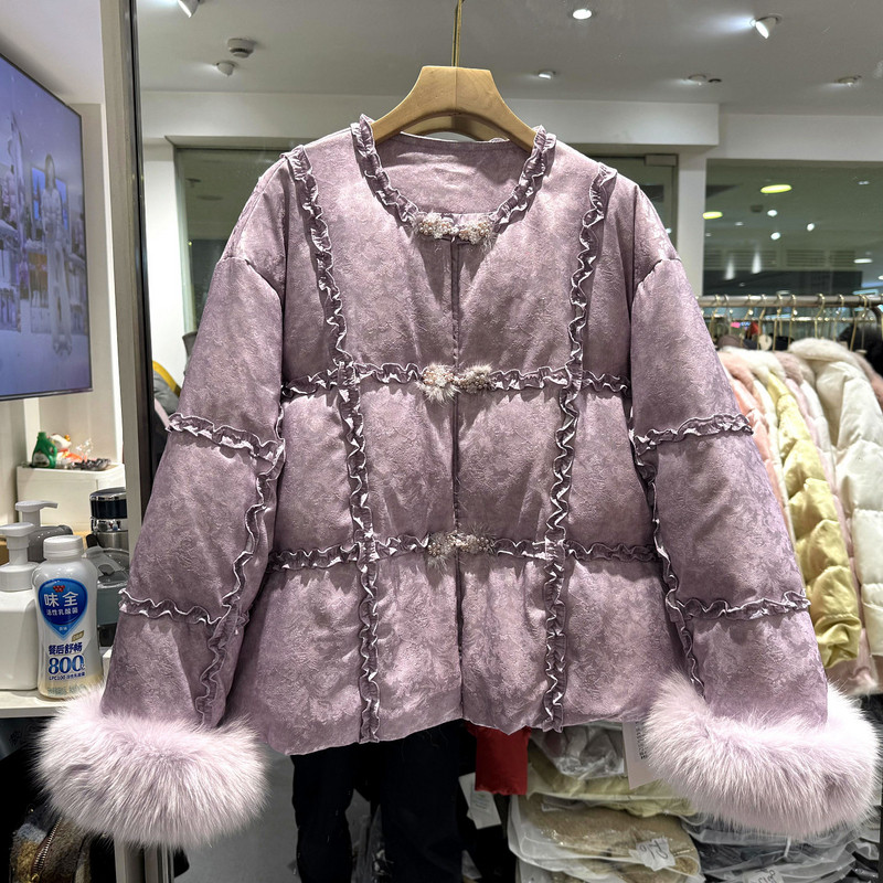 凡爱8678 木耳花边设计感狐狸毛袖口提花洋气小个羽绒服欧货冬装