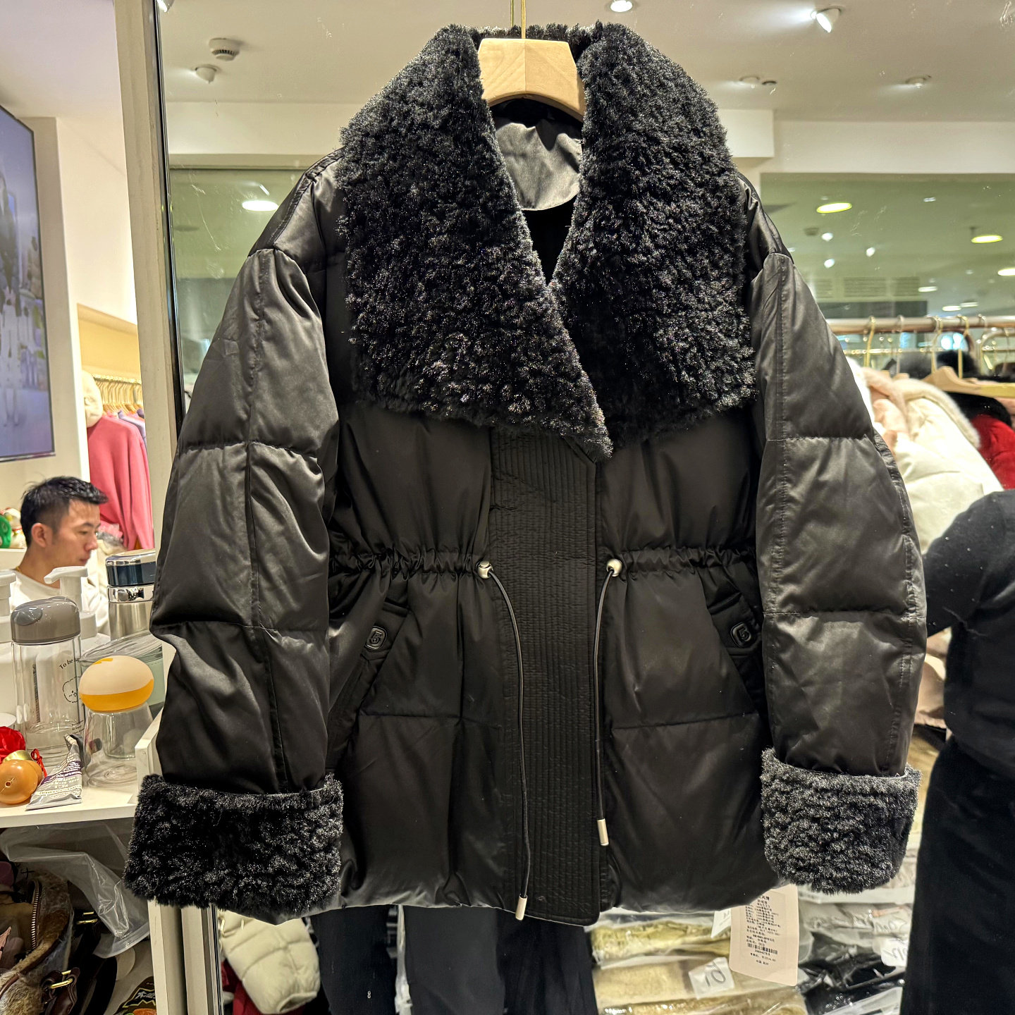 W8533 羊羔毛皮毛一体大翻领袖口毛抽绳收腰小个中长羽绒服欧货冬
