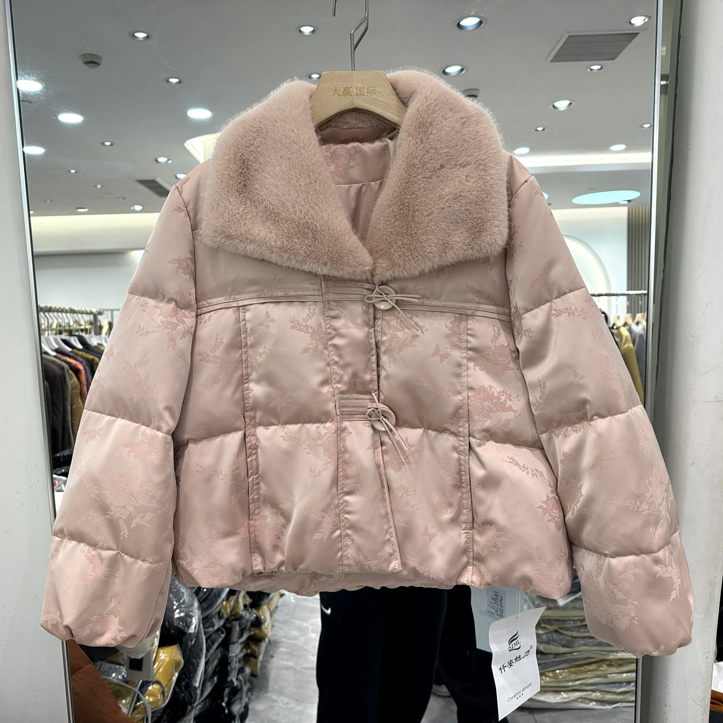 仟姿魅力6816 仿水貂毛翻领两粒扣人丝提花国风短装羽绒服欧货冬