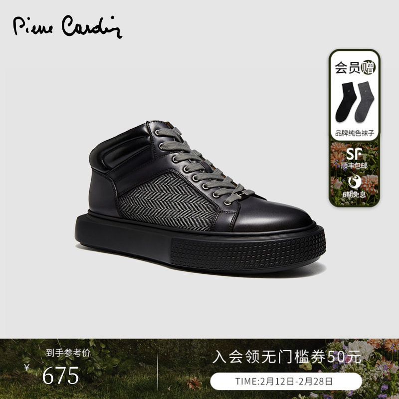 皮尔卡丹男鞋真皮潮流百搭系带皮革拼接织物高帮圆头撞色休闲鞋男