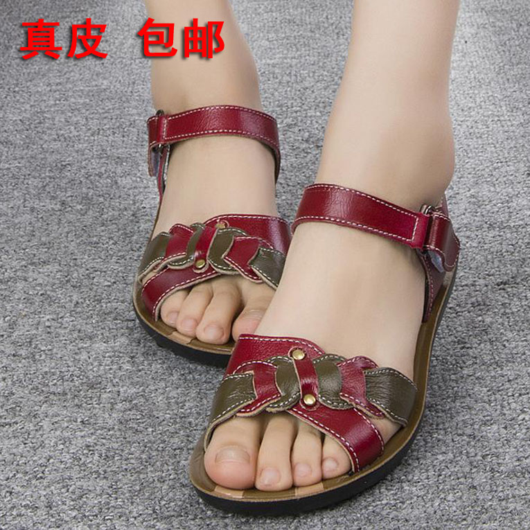 41大码女鞋43牛皮平跟露趾软底防滑中年妈妈鞋45加肥中老年凉鞋46