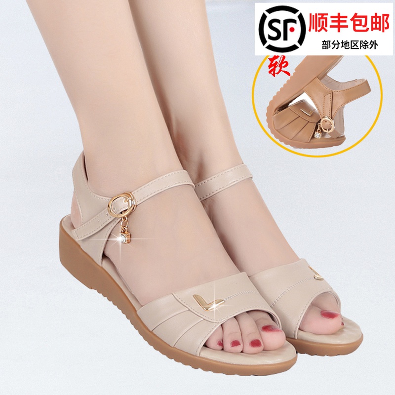 夏中年女凉鞋妈妈鞋真皮平跟平底舒适软底大码41中老年妇女凉鞋43