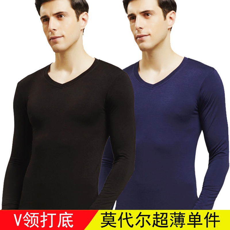 男士莫代尔内衣上衣薄款 男超薄款V领长袖单件秋衣修身弹力打底衫