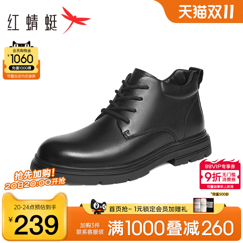 红蜻蜓高帮棉鞋冬季新款男鞋真皮商务皮鞋保暖加绒短靴中年爸爸鞋