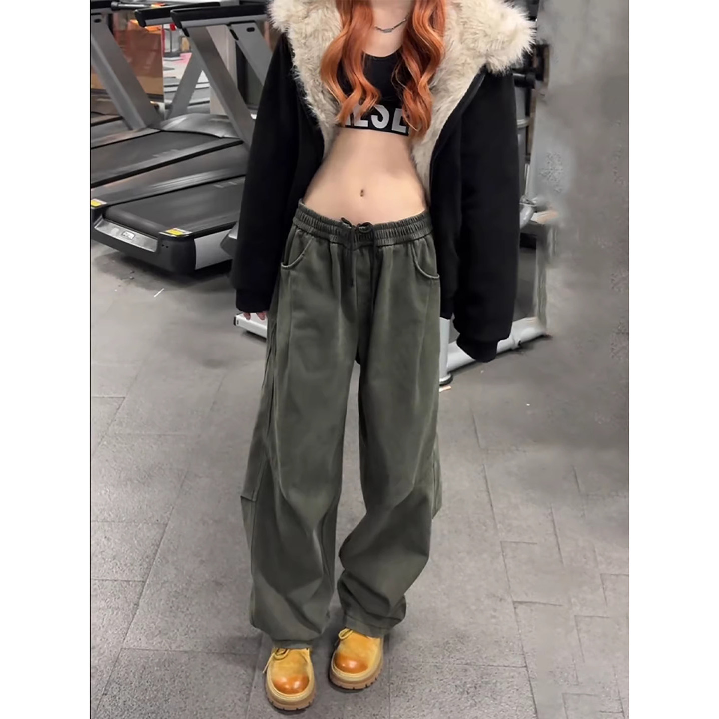 花吉L056军绿色高腰磨毛褶皱日系宽松休闲裤女2025新款秋长裤