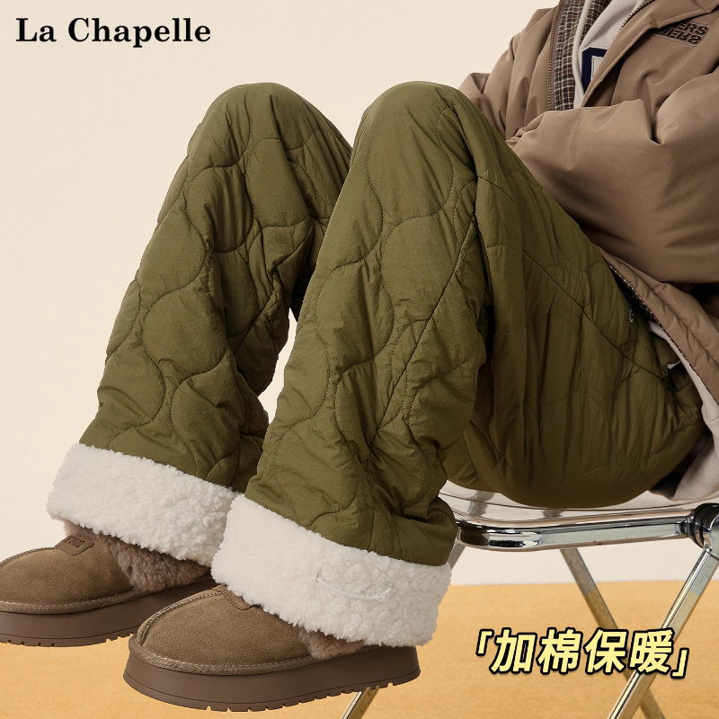 拉夏贝尔军绿色葫芦纹巨厚保暖休闲棉裤男女冬季加绒直筒运动长裤