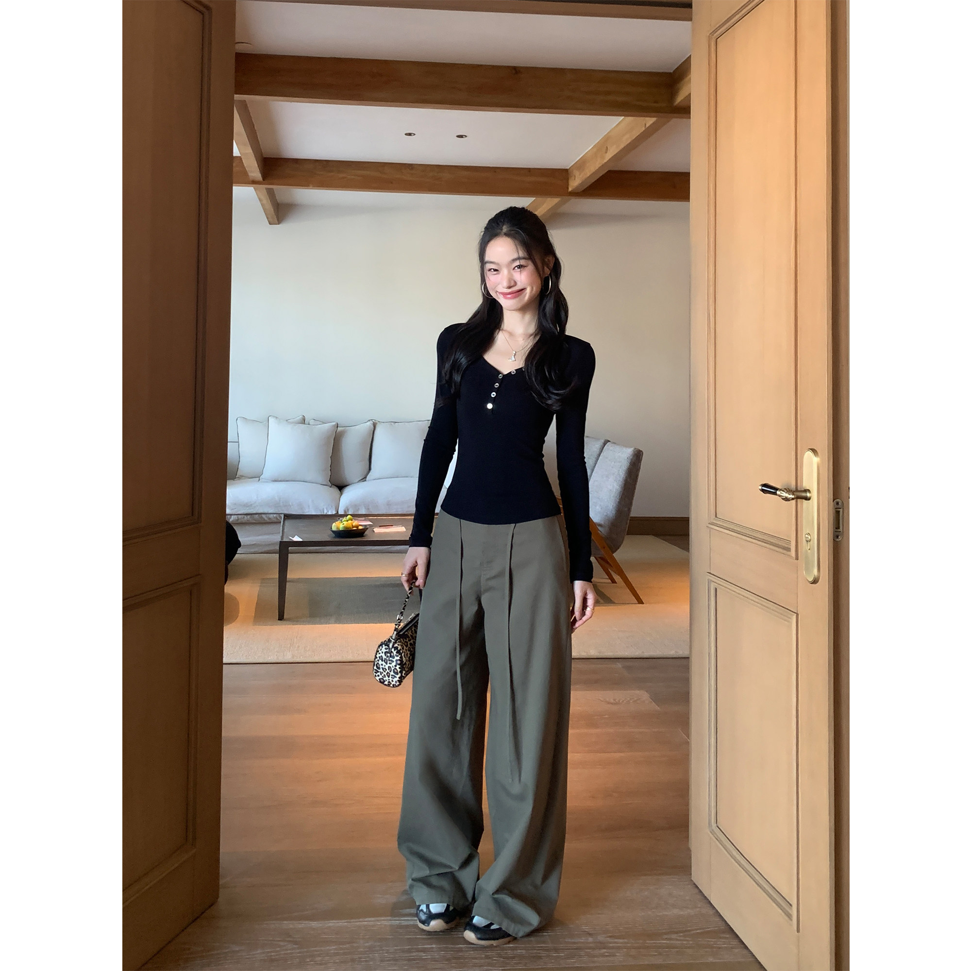 LINY LIBERTY 25SS 复古设计感军绿色低腰卫裤女宽松休闲垂感长裤