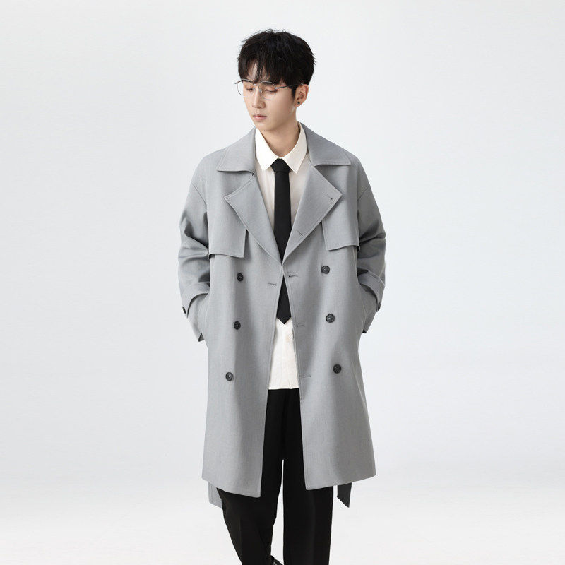 2025秋季英伦风韩版宽松中长款潮牌风衣外套美式大衣男式冰蓝色