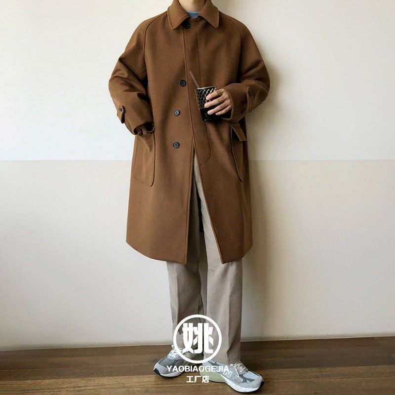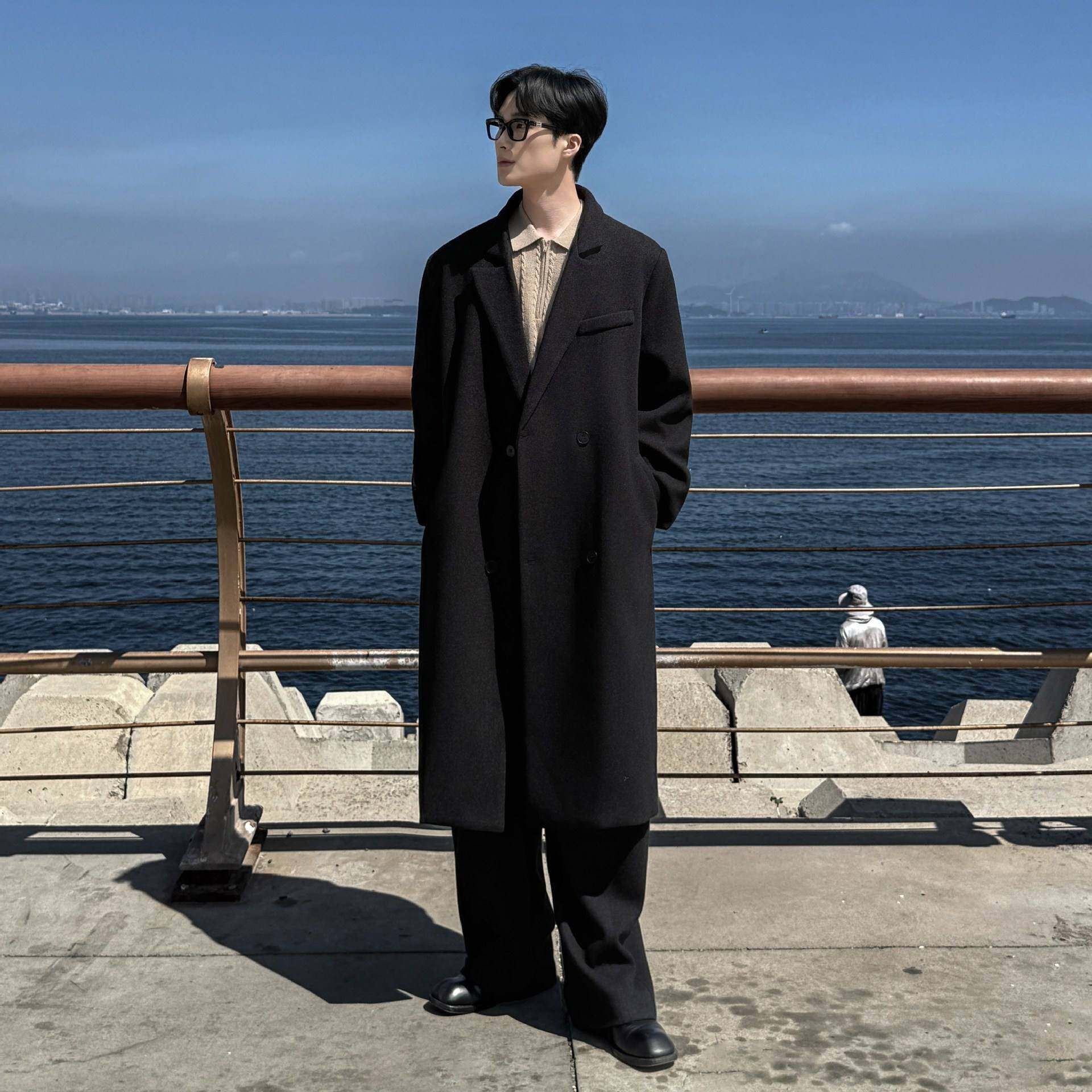 W韩国订单 时髦感翻领大衣男式中长款秋冬加厚英伦风衣毛呢长外套