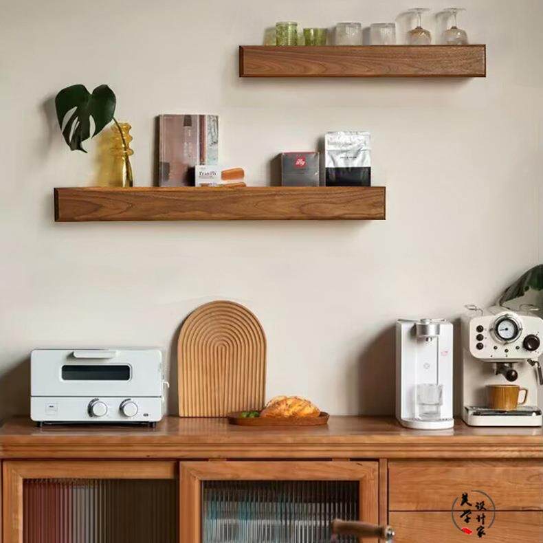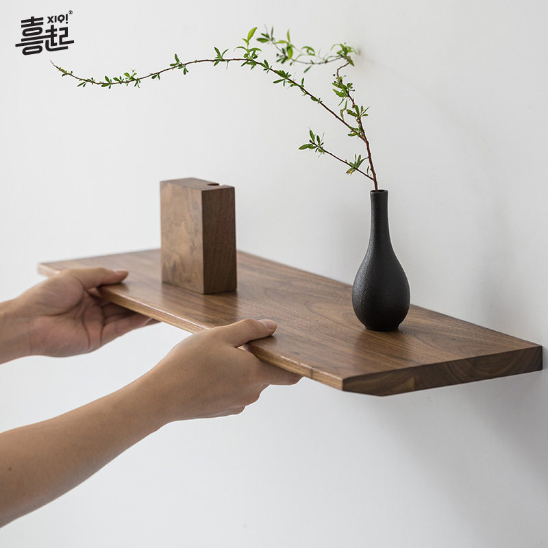 喜起黑胡桃实木墙上搁板 木质墙面一字板置物架 挂墙一字型隔板