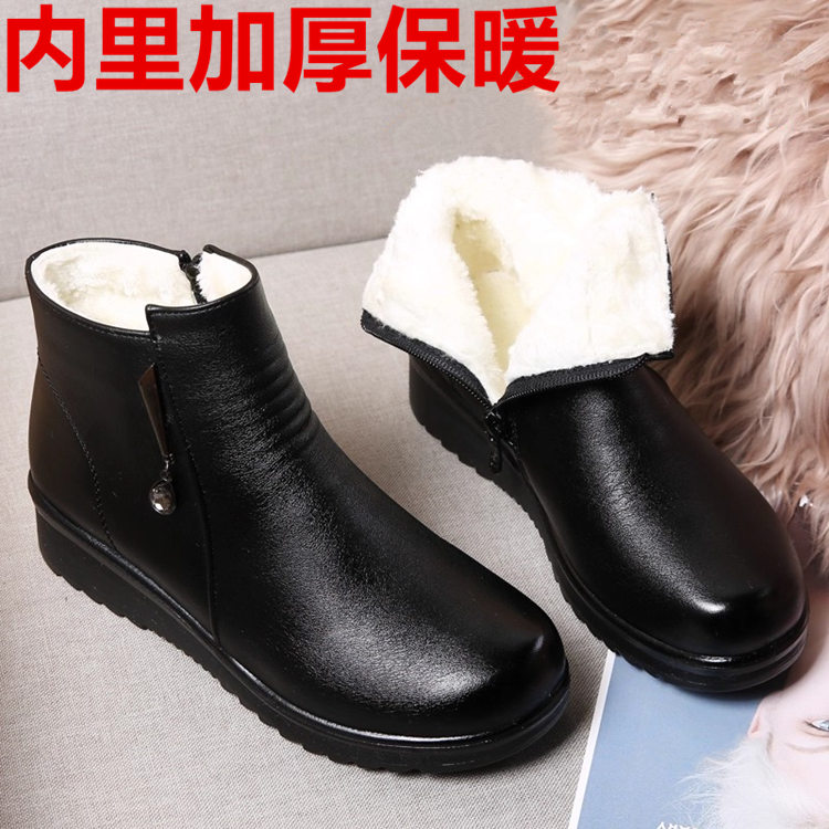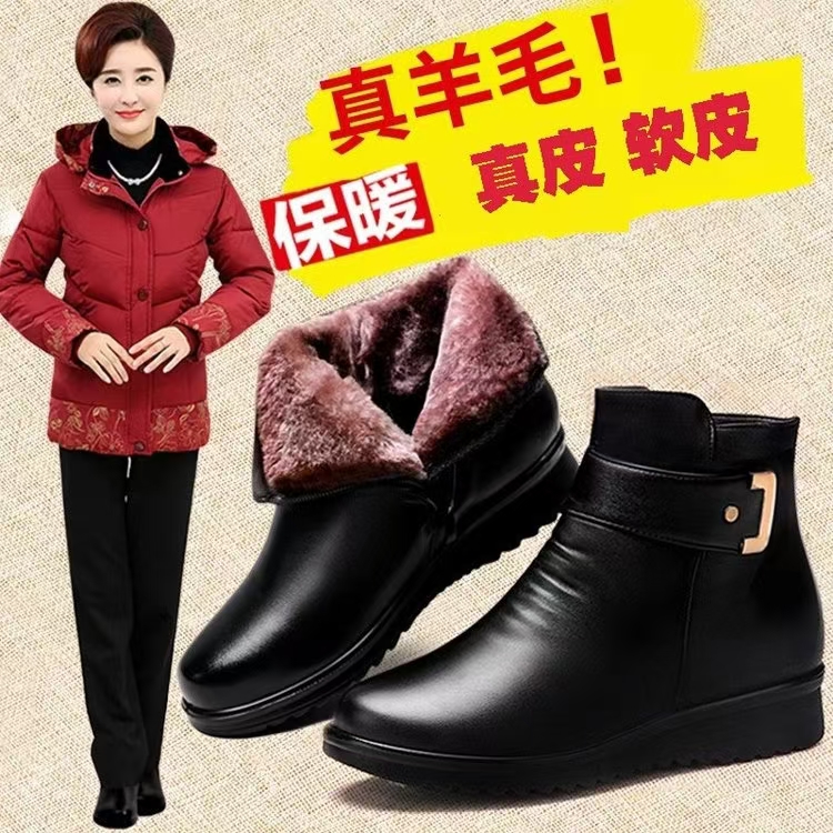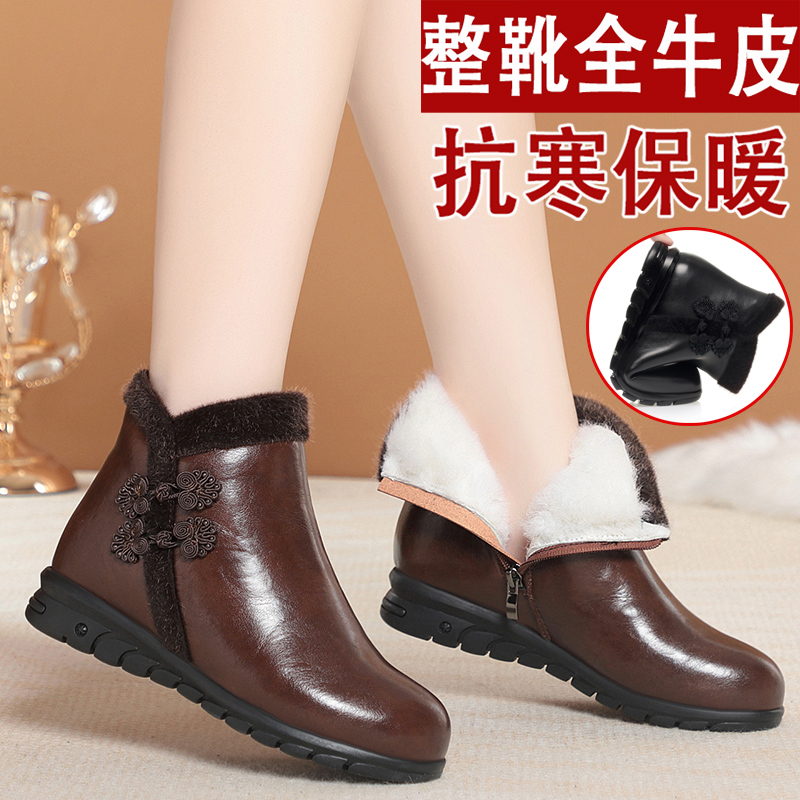 妈妈老人棉鞋保暖真皮加绒皮鞋羊毛短靴女中老年大码平底防滑冬季