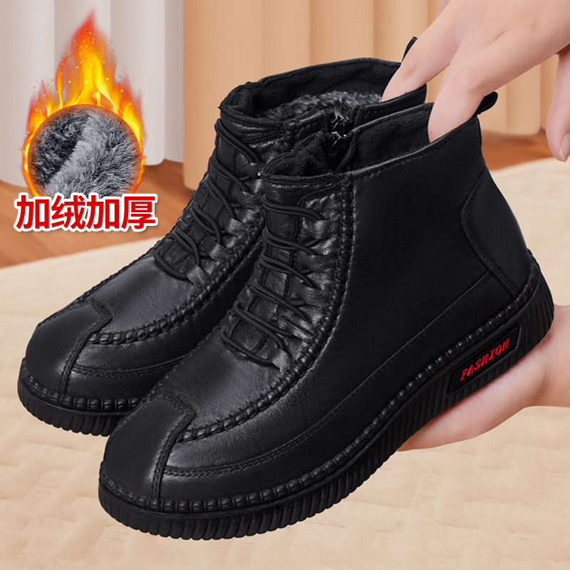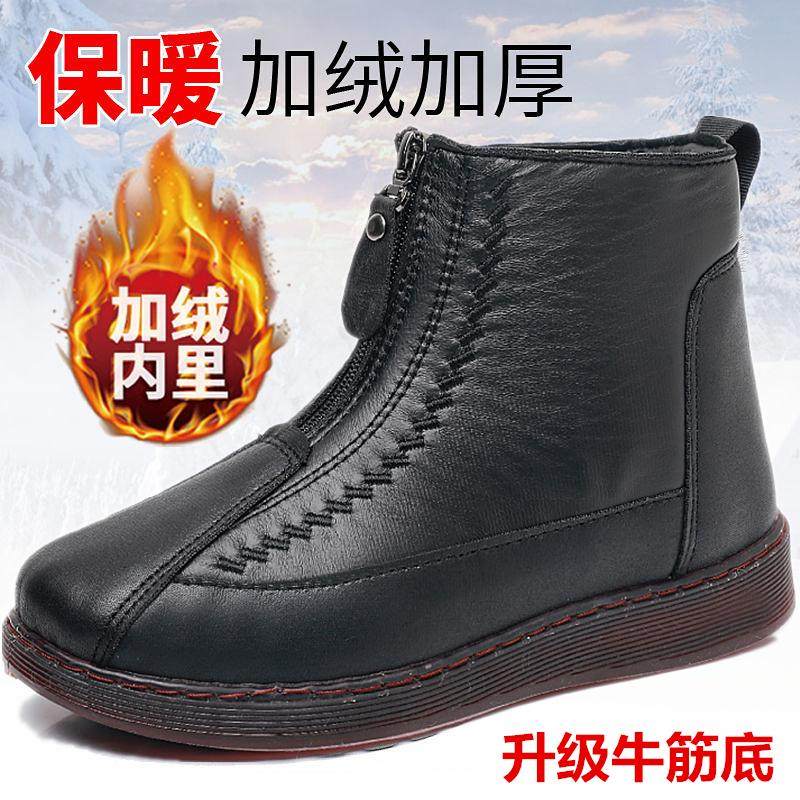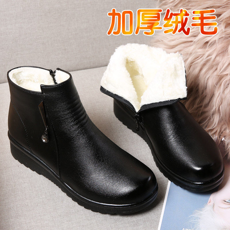 冬季妈妈老人棉鞋保暖真皮加绒皮鞋短靴女中老年大码平底防滑棉鞋