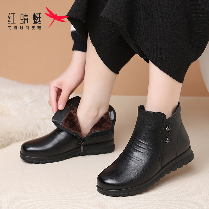 红蜻蜓正品头层牛皮妈妈老人棉鞋保暖真皮加绒皮鞋短靴女中老年软