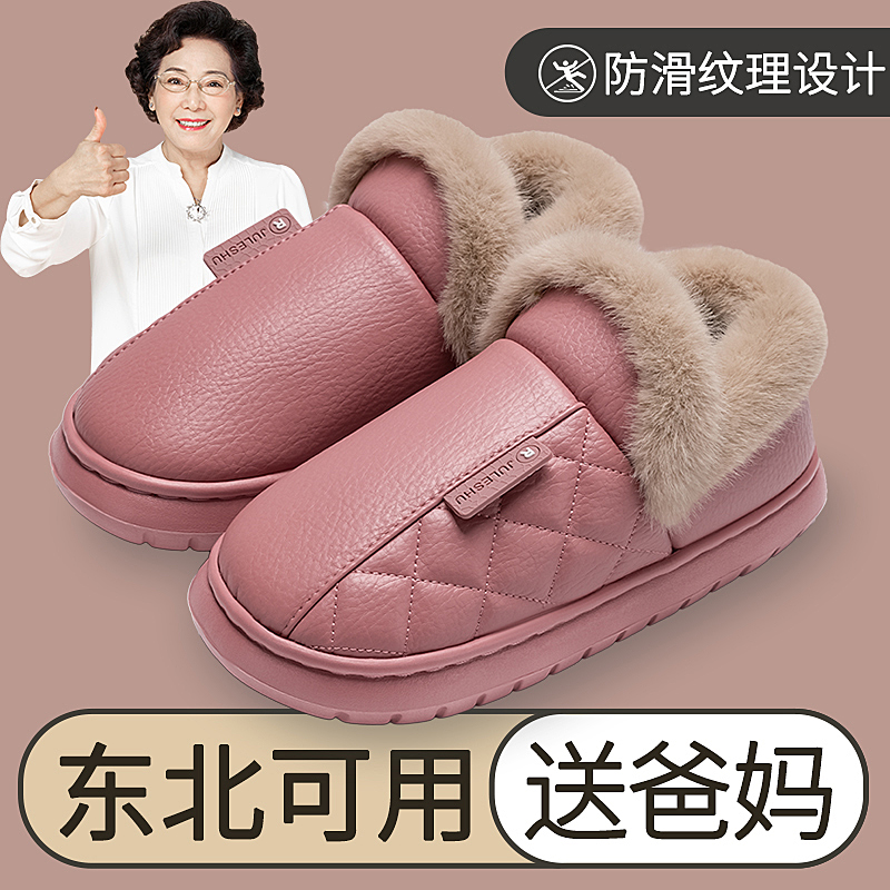 老人防水棉拖鞋女冬季防滑加绒2025新款保暖全包跟老年皮棉鞋女款
