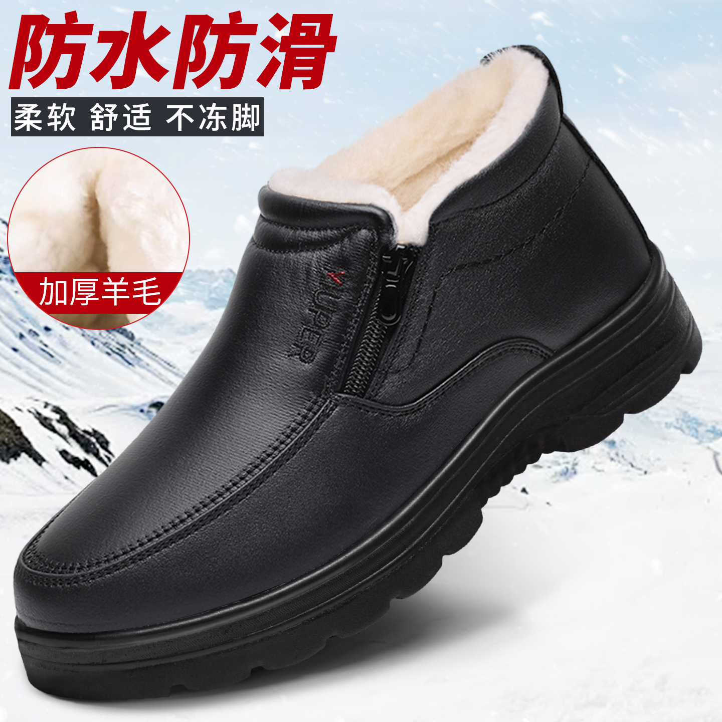 老北京布鞋男冬加绒加厚羊毛老人棉鞋保暖中老年防水防滑爸爸皮鞋