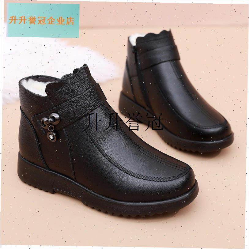 冬季妈妈老人棉鞋保暖真皮加z绒皮鞋女羊毛短靴中老年女鞋平底防,