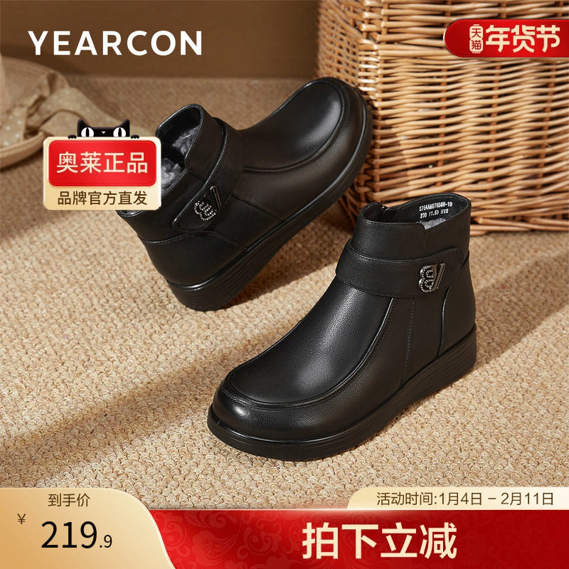 意尔康冬季妈妈老人棉鞋保暖真皮加绒皮鞋绒毛短靴女中老年平底防