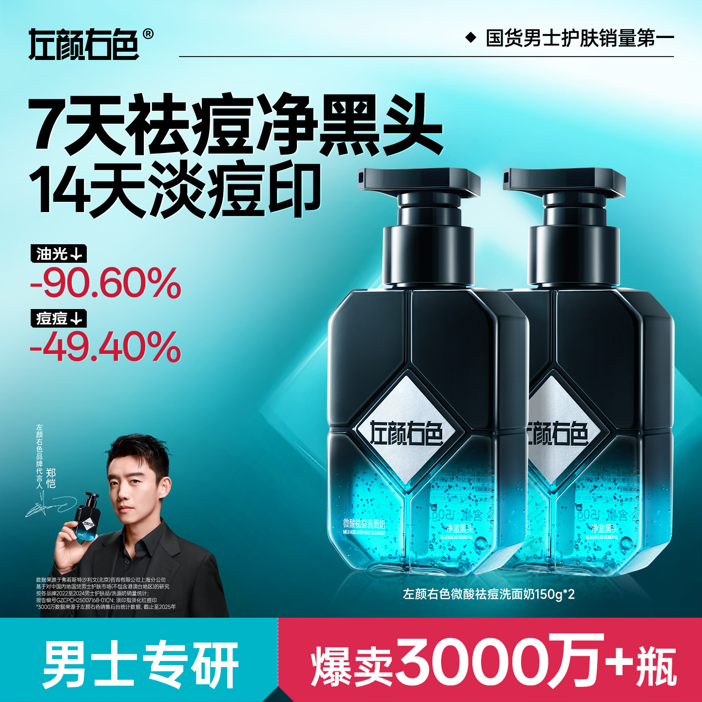 郑恺代言左颜右色男士控油祛痘洗面奶微酸氨基酸洁面乳净黑头专用
