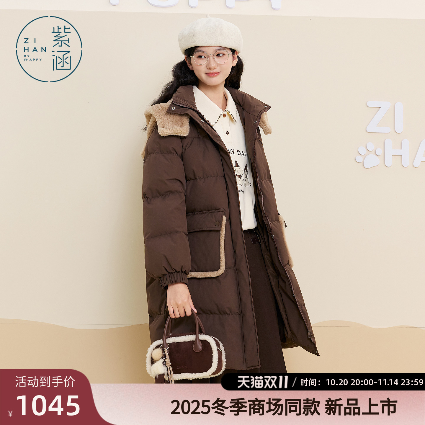 紫涵中长款咖格羽绒服女2025冬季新款复古可脱卸毛绒连帽鸭绒外套