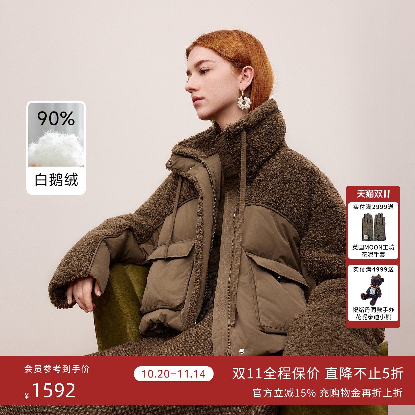 美拉德棕咖色羊羔毛绒拼接翻领羽绒服女2025冬季新短款小个子外套