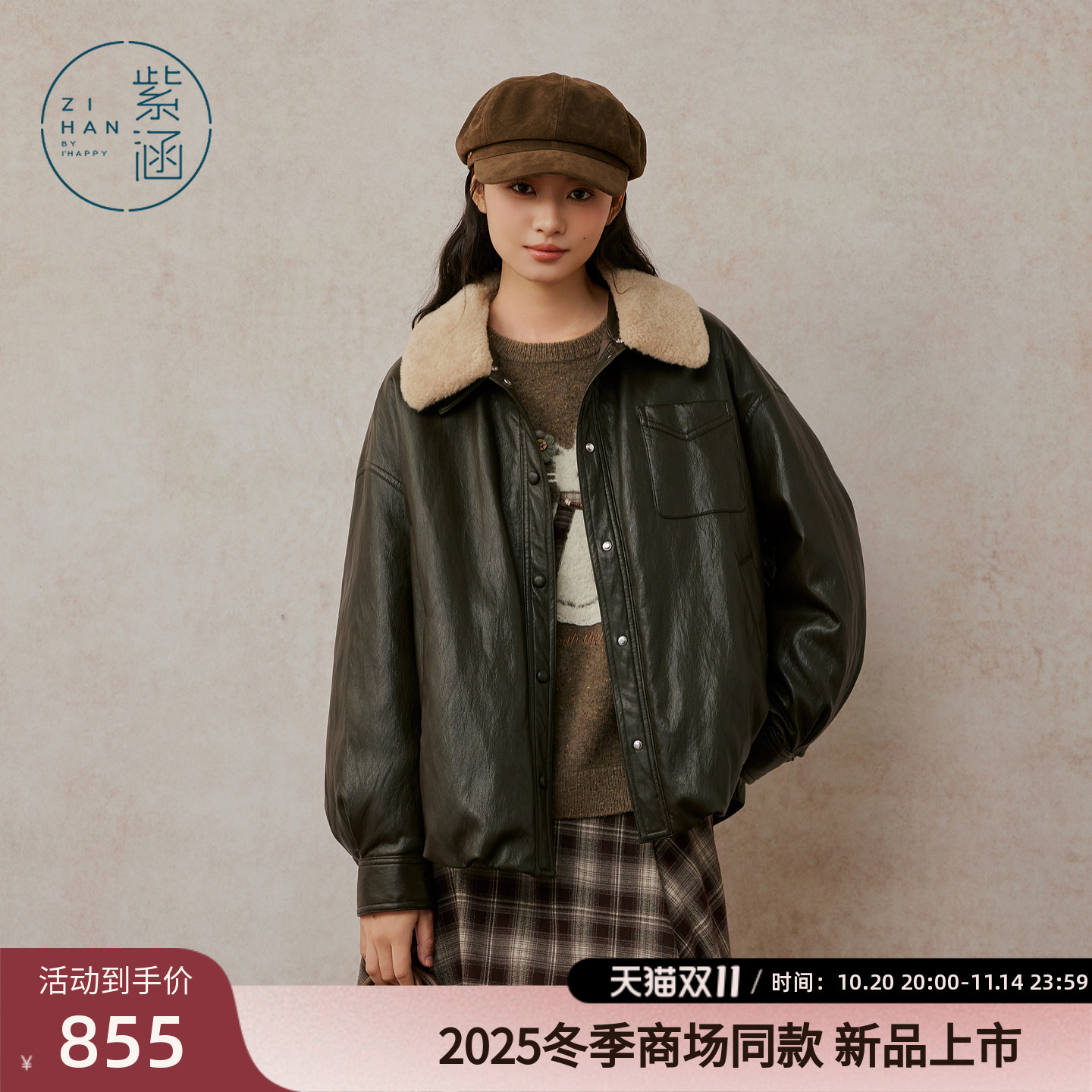 紫涵短款毛绒翻领羽绒服皮衣女2025年冬季新款复古微皱感鸭绒外套