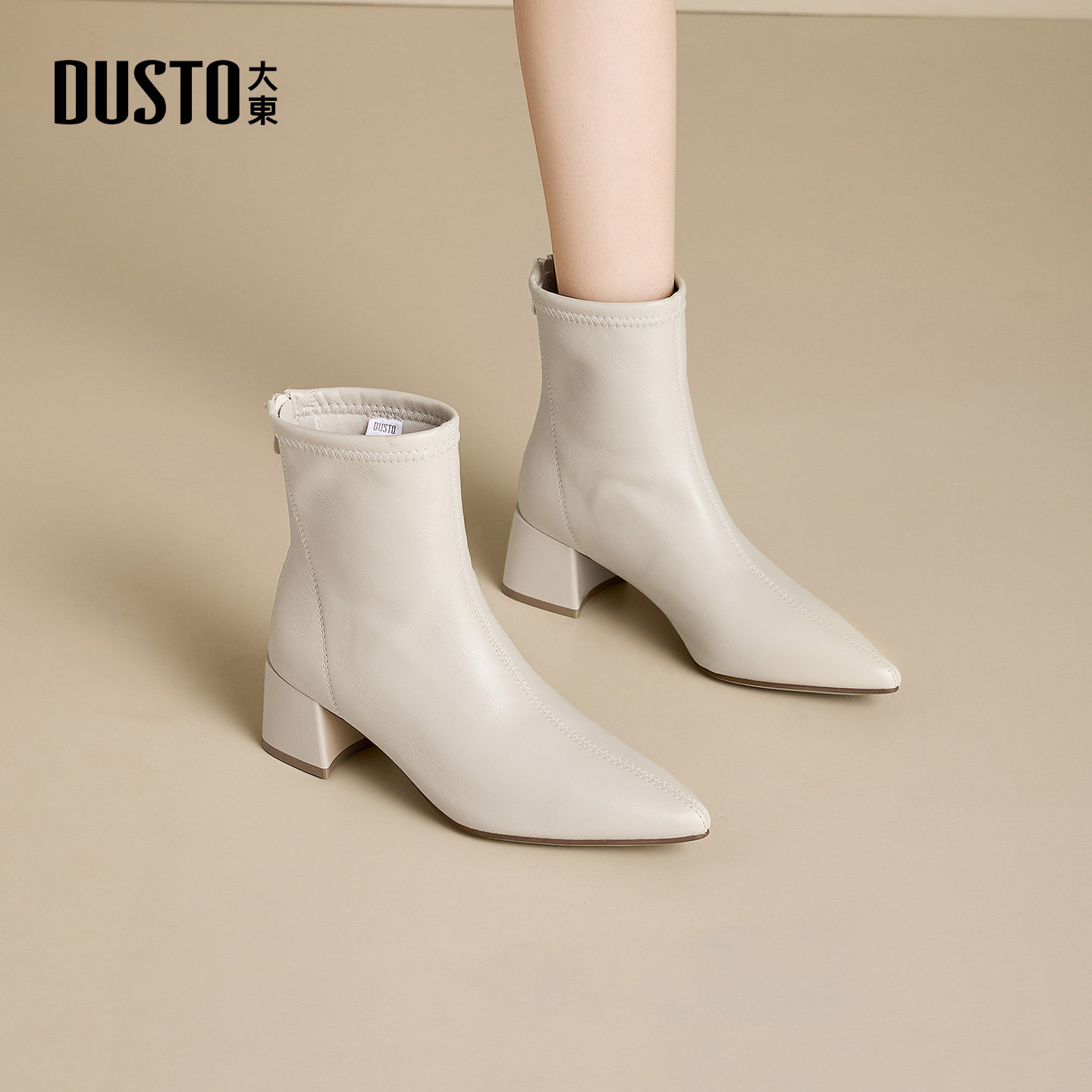 大东女鞋时装靴2025冬季新款时尚百搭简约舒适尖头粗跟通勤女单鞋