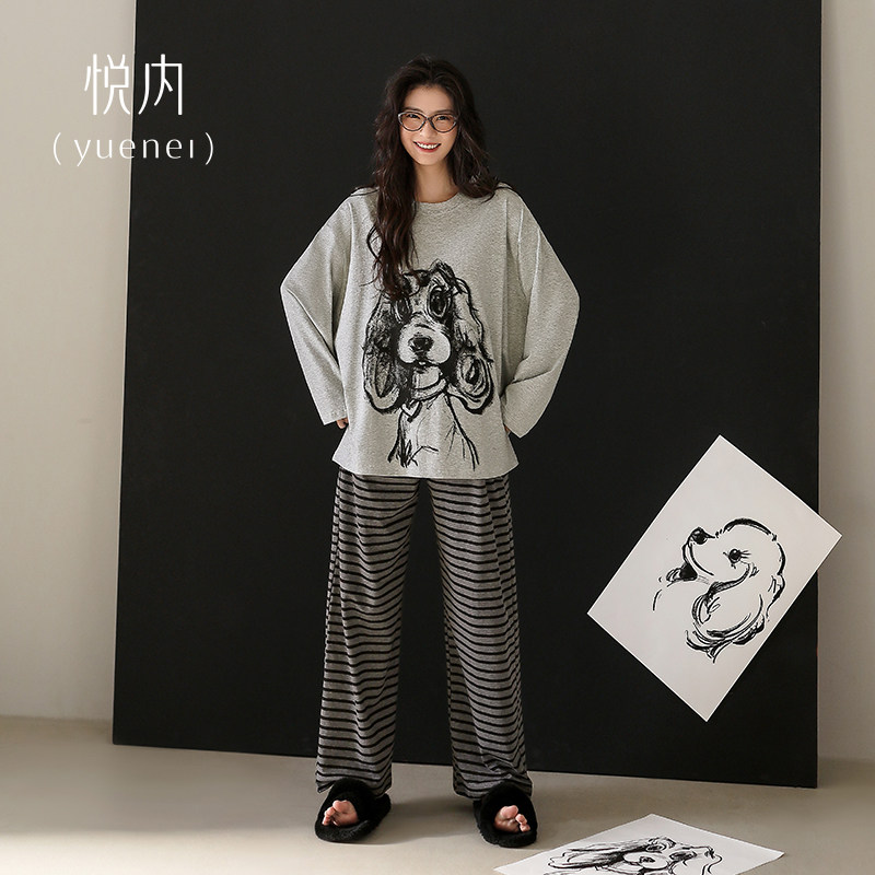悦内睡衣女春秋款秋季纯棉长袖家居服时尚休闲圆领套头素描可爱狗