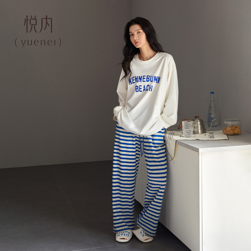 悦内睡衣女春秋款秋季长袖纯棉家居服条纹休闲可外穿出门圆领套头