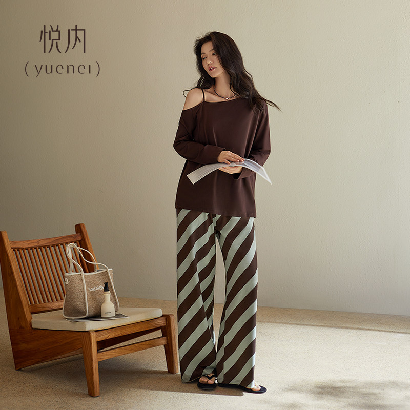 悦内睡衣女款春秋季长袖纯棉家居服套头时尚休闲露肩斜领新款套装