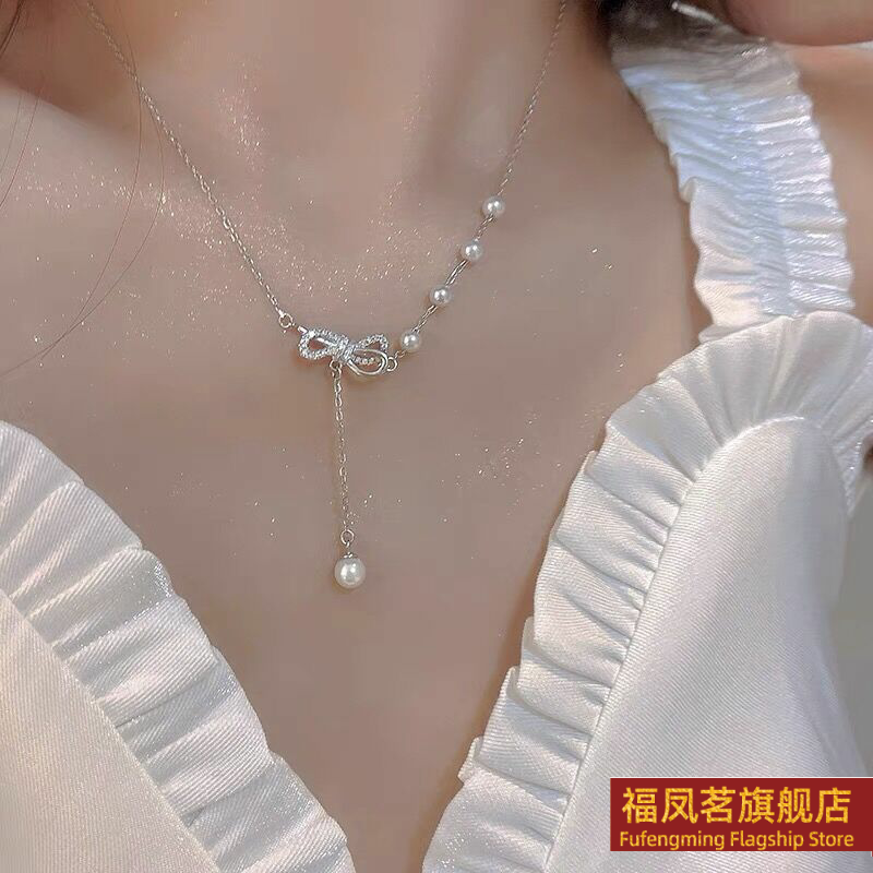 正生蝴蝶结珍珠纯银项链女刻字高级感礼物新款气质个性网红锁骨链